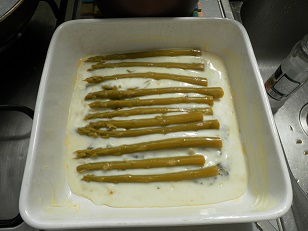 Beurrez un moule, lorsque les pâtes sont al dente , déposez 2 plaques de pâtes à lasagne au fond du moule puis étalez une couche épaisse de pesto, recouvrez de béchamel puis disposez les asperges