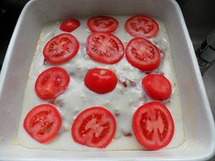 Mettez à nouveau 2 pâtes à lasagne, étalez la purée de tomate au parmigiano, recouvrez de béchamel puis disposez les tomates